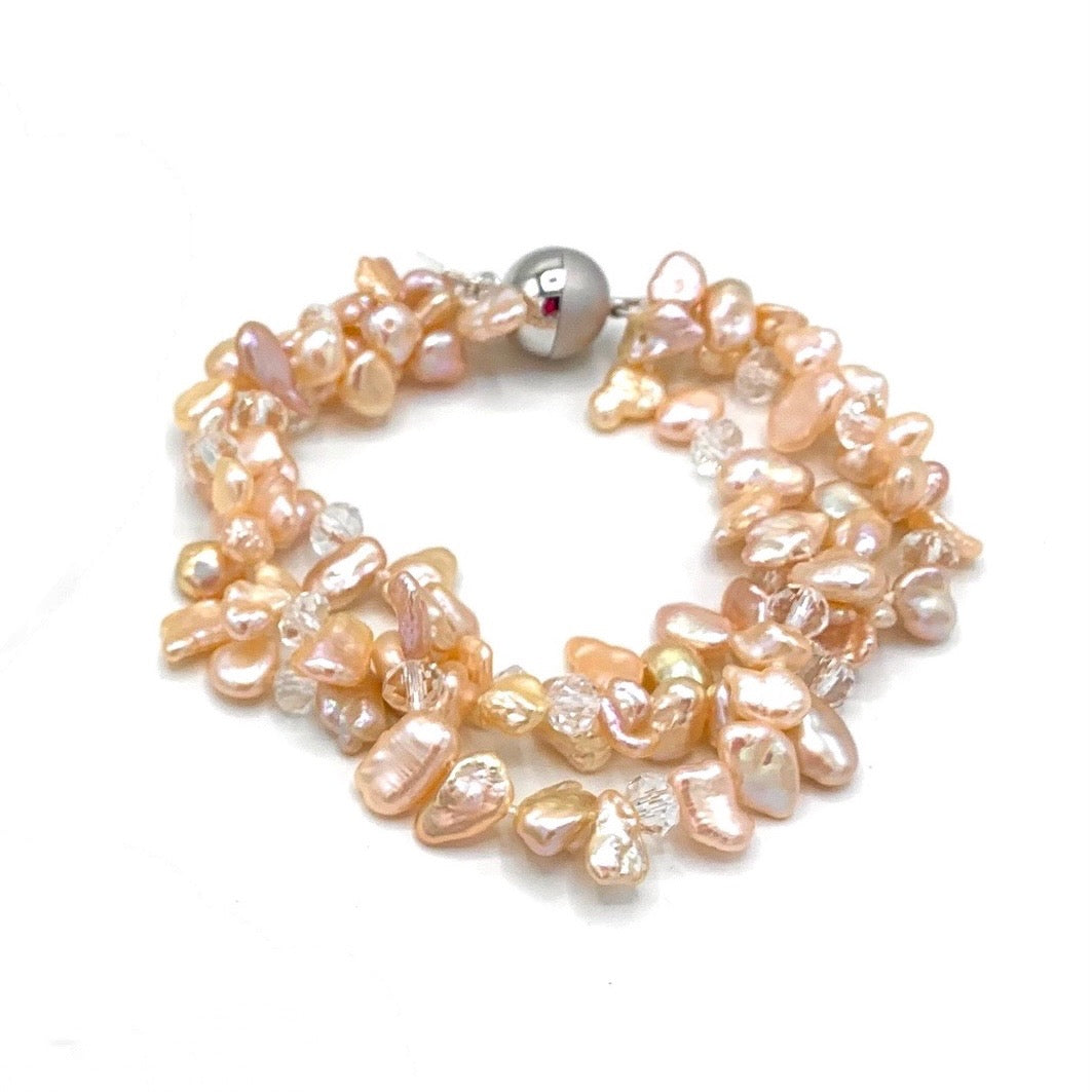 3-Strand Pink Freshwater Cultured Keshi Pearl & Ice Crystal Bracelet Double-Knotted on Silk w/ Silver Plated Magnetic Ball Clasp 7.5."