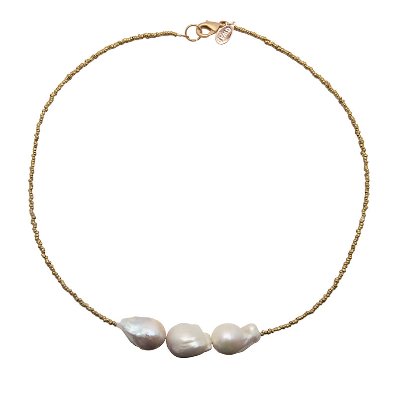 Vintage Brass Beads w/ 3 Large White Freshwater Cultured Baroque Wild Pearls on Gold-Plated Hammered Toggle Clasp 18"