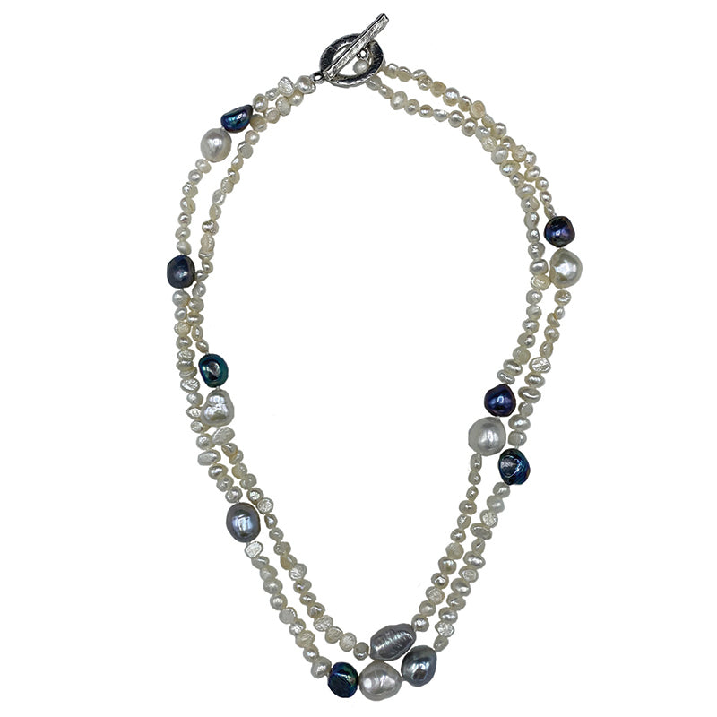 This 18" double-strand necklace features luminous dark mix (white, gray & black) of Keshi freshwater pearls, celebrated for their unique, petal-like shapes and extraordinary natural luster. Double knotted on silk & finished with a hammered gold-plated toggle clasp,