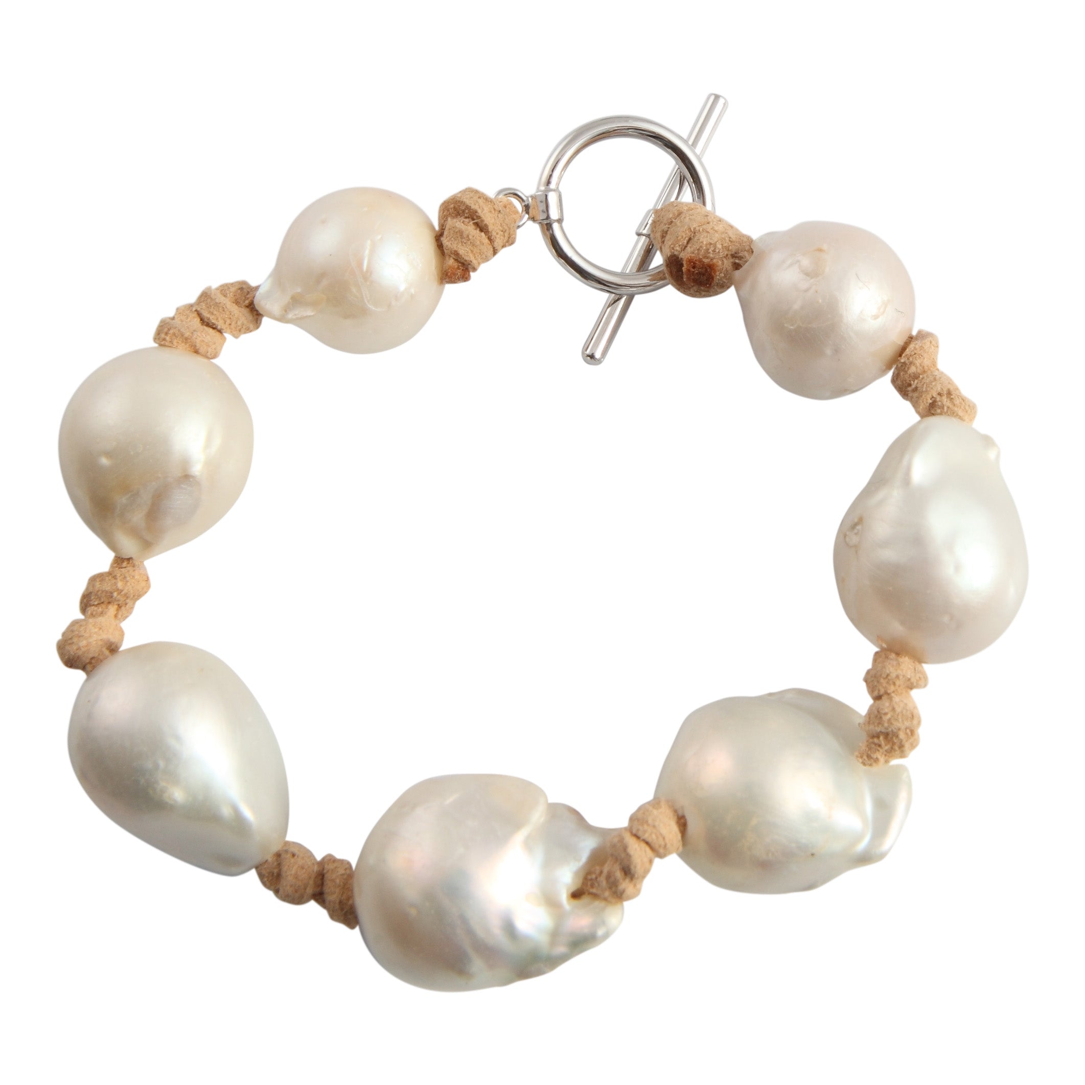 Baroque Wild Pearl & Suede Bracelet This 7.5" bracelet features large, lustrous white freshwater baroque "wild" pearls, hand-knotted on soft tan vegan suede. The organic textures are finished with a sleek silver toggle clasp for a chic, rustic-luxe look.
